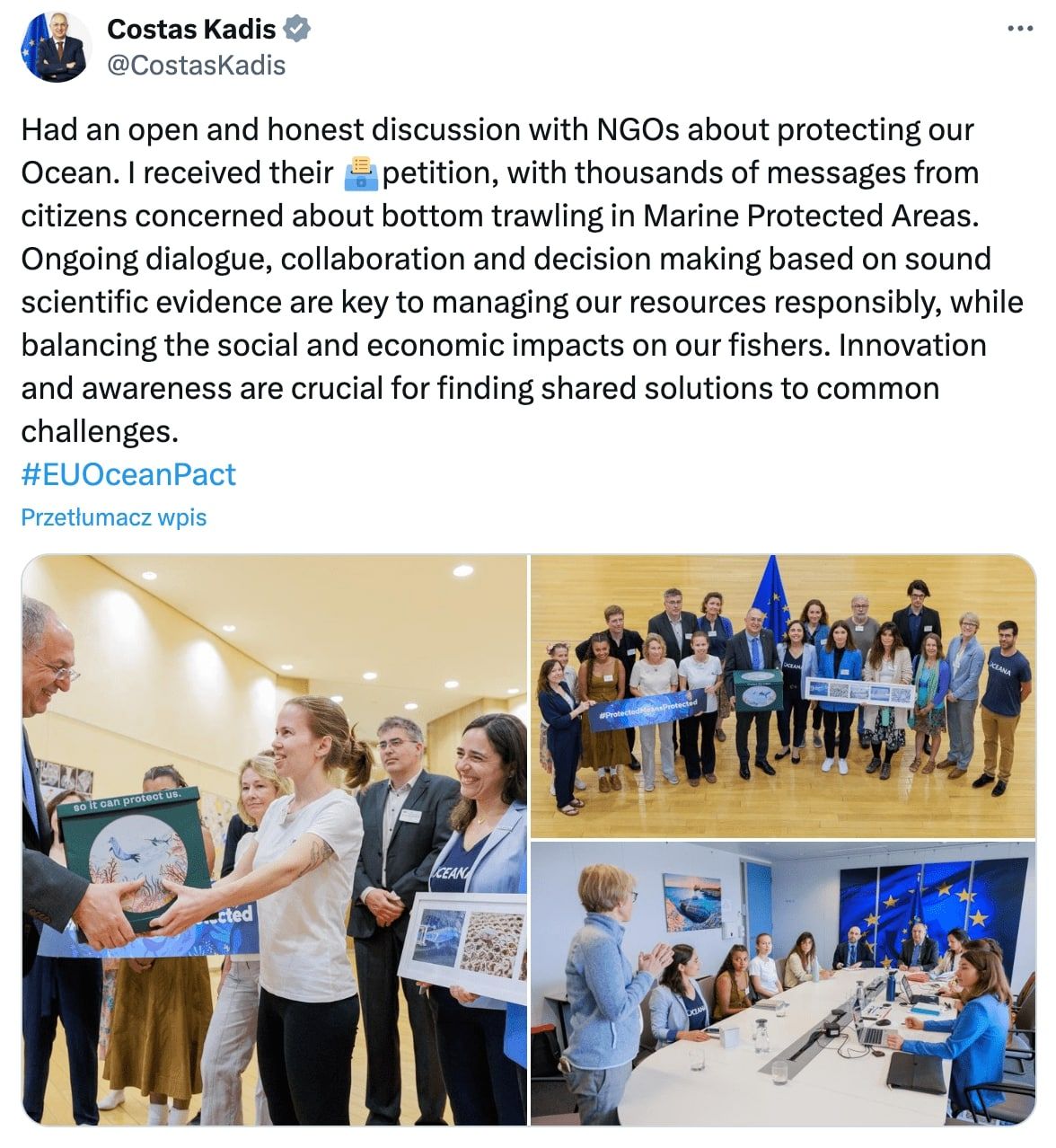 - 1.350 van jullie stuurden een e-mail naar EU-commissaris voor Visserij en Oceanen, Costas Kadis, en riepen hem op zich in te zetten voor échte oceaanbescherming - net vóór zijn hoorzitting, zodat hij zijn nieuwe functie begon met een duidelijk signaal van de burgers.